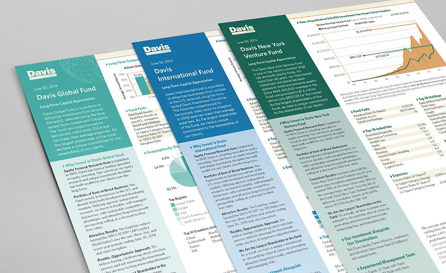 Davis Advisors is an independent, employee-owned investment management firm founded in 1969. Their time-tested investment discipline is offered to clients through mutual funds, variable annuities, separately managed accounts, and offshore funds. Since their founding more than 45 years ago, their mission has been to serve their shareholders and to do so with high integrity. For 21 of those 45 years, Cisneros Design has helped create and manage the Davis Advisors brand, helping the company grow from approximately $800 million to over a $110 billion.